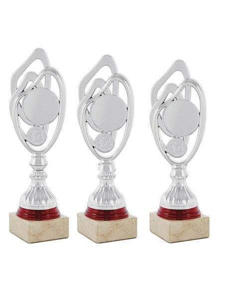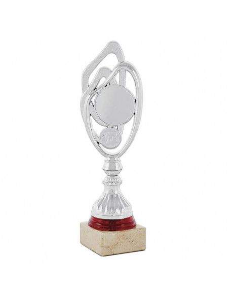 Copa participativa fabricada en plástico y peana de mármol color crema. Diseño alegórico con mapa del mundo. Detalle de anillo metálico en color rojo en la base. Tres tamaños disponibles. Posibilidad de disco frontal para personalización del evento.