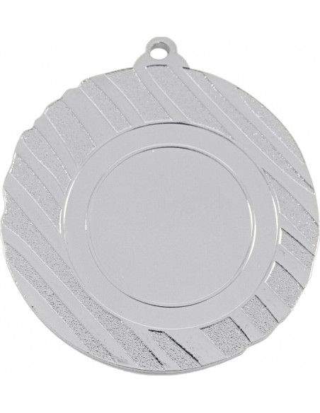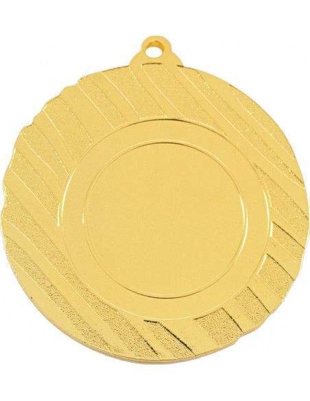 Medalla deportiva con rayas fabricada en metal con baño de color oro, plata o bronce. Diseño con circulo central y ranura para cinta. Grabación en la parte posterior incluida en el precio junto con una cinta a elegir de 1 cm. Cantidad mínima 25 unidades.