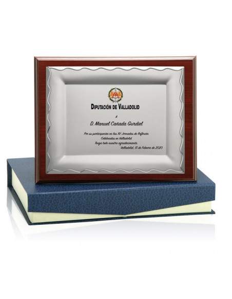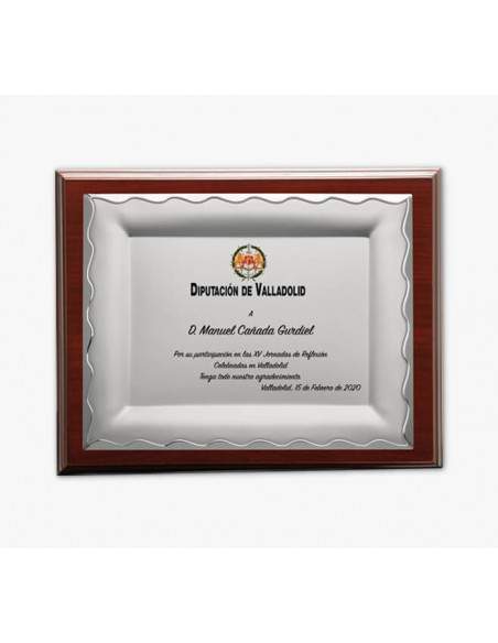 Placa homenaje con lámina de acero bañada en plata. Personalización a todo color del diseño a medida que desees. Dos medidas disponibles: 29 x 23 cm y 24 x 19 cm. Elegante placa para conmemoraciones y reconocimientos de empresa como jubilaciones, premios, o agradecimientos.