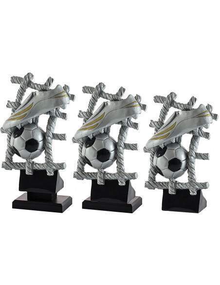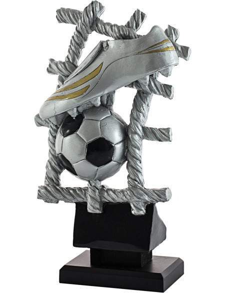 Trofeo con bota para fútbol fabricado en resina de color plateada con efecto envejecido. Diseño con red de portería, bota y balón. Peana de color negro. Disponible en tres tamaños diferentes. Inscripción con chapa personalizada en la parte frontal incluida en el precio.