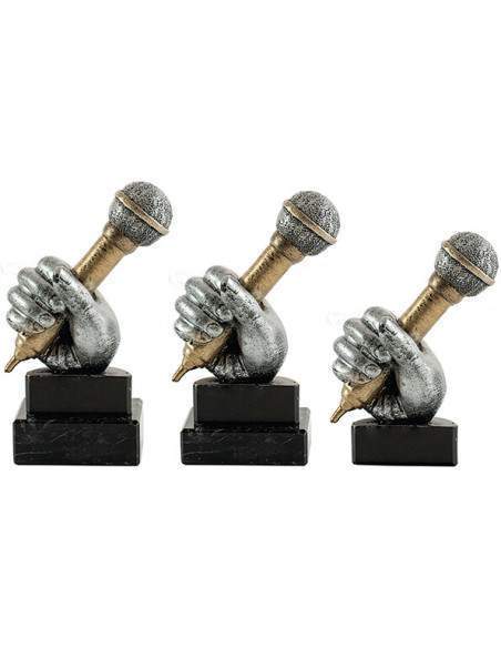 Trofeo mano y micrófono ideal para concursos musicales o de canciones. Trofeo personalizado diseñado con una mano que sujeta un micrófono sobre peana de color negro. Inscripción en chapa personalizada a medida. Disponible en tres tamaños diferentes para los diferentes clasificados.