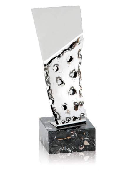 Trofeo para aniversario de boda fabricado en acero de color plateado con detalles de corazón y anillos entrelazados. Doble placa irregular con una base lisa y una troquelada en la parte delantera. Peana de color negra fabricada en mármol jaspeado. Inscripción en placa metálica incluida en el precio. Tres tamaños disponibles a elegir.