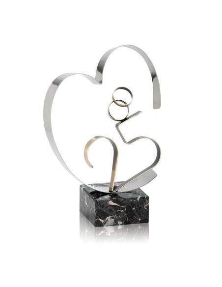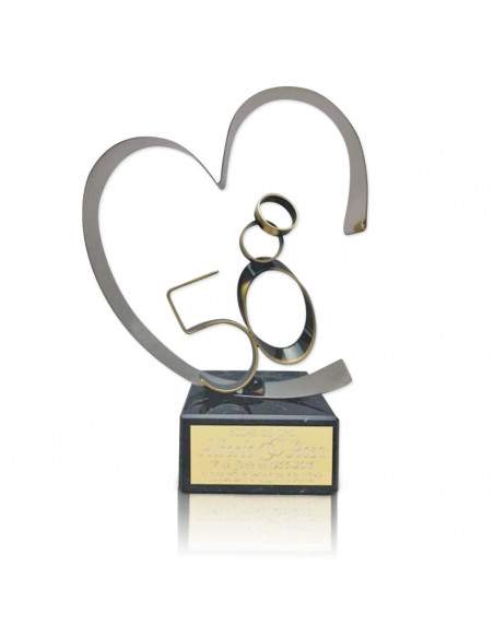 Trofeo para Bodas de Oro fabricado en acero. Original diseño con forma de corazón y símbolo numérico de 50 con alianzas entrelazadas. Modelo disponible también con el número 25 para bodas de plata. Peana de mármol en color negro con forma cuadrada. Especial combinación de acero en dos colores. Ambos modelos tienen disponibles 3 tamaños diferentes. Personalización mediante placa en la peana con inscripción a medida.