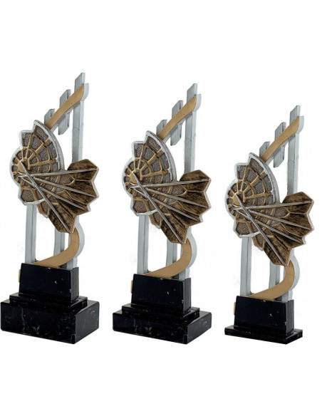 Trofeo para dardos fabricado en resina con efecto envejecido en color plata y oro. Diseño de media diana con tres dardos. Peana de color negro con inscripción personalizada incluida en el precio. Disponible en diferentes tamaños para los clasificados: 26 cm, 25 cm y 23 cm.