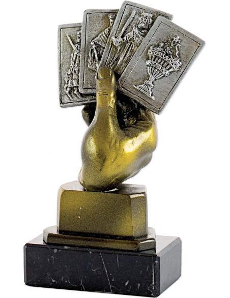 Trofeo para mus fabricado en resina envejecida con diseño de mano sujetando cuatro naipes de la baraja española. Disponible en tres tamaños diferentes. Peana de mármol en color negro jaspeado en los tamaños superiores. Efecto envejecido. Chapita inscrita a medida incluida en el precio de cada unidad.