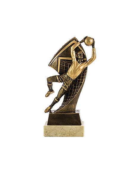 Trofeo para portero de fútbol fabricado en resina de color dorado envejecido. Diseño con original forma de portero en posición de parada en portería. Peana de mármol de color crema en los dos tamaños superiores con placa inscrita incluida en el precio. Tres tamaños diferentes disponibles.